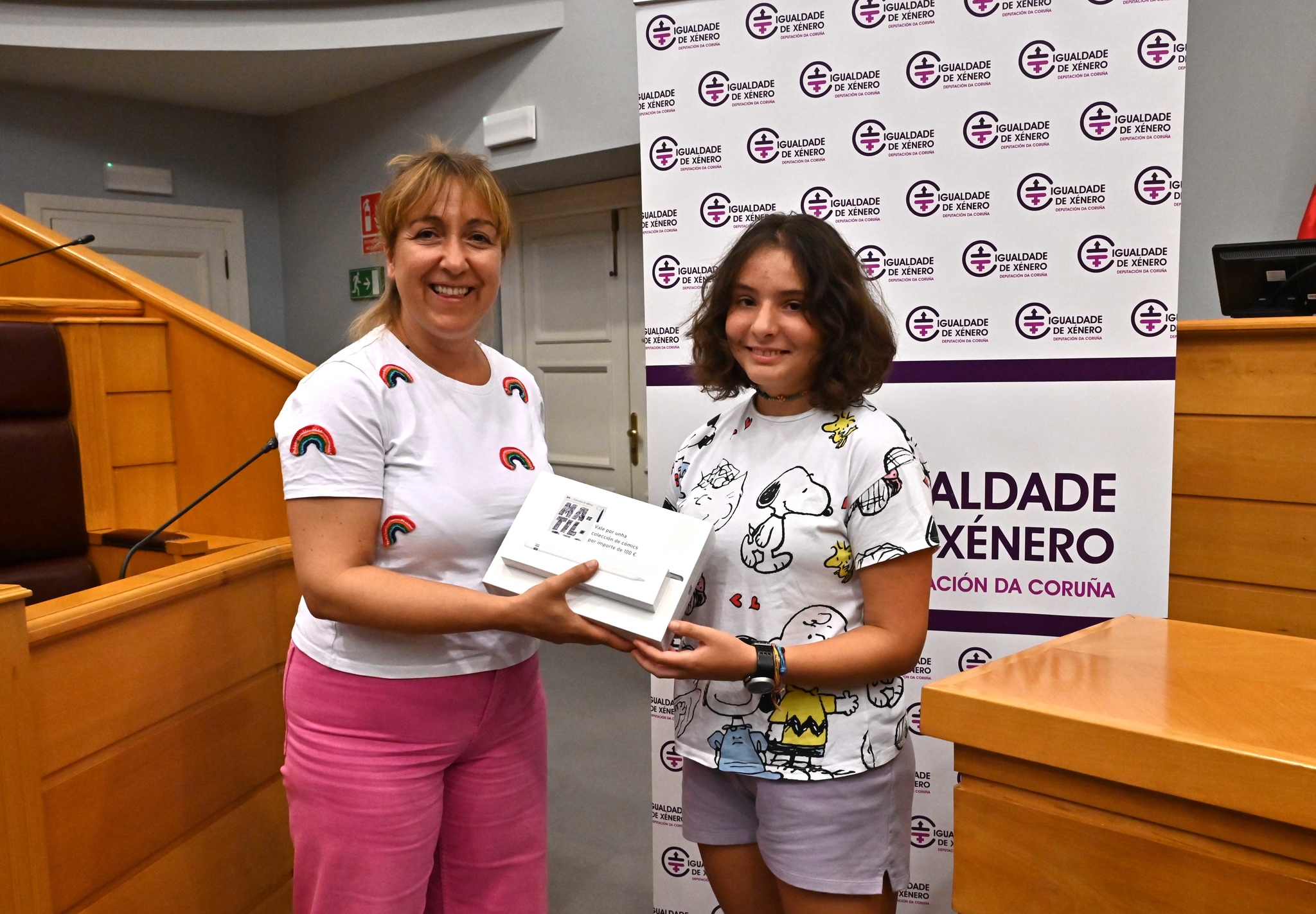 A deputada de Igualdade, María Muíño, vén de facer entrega dos premios do XIII Concurso de Viñetas para alumnado de secundaria convocado pola Deputación da Coruña. O acto, que tivo lugar no Salón de Plenos da institución provincial, reuniu á gañadora do primeiro premio da categoría A, Vega Menéndez, de 13 anos e residente en Culleredo; á do segundo premio Inés Grau, tamén de 13 anos e residente na Coruña, e á do terceiro, Ainara Soto, de 12 anos e residente na Coruña. Non estivo presente a gañadora da categoría B, Laura Mayo, de 17 anos, residente en Valladolid.