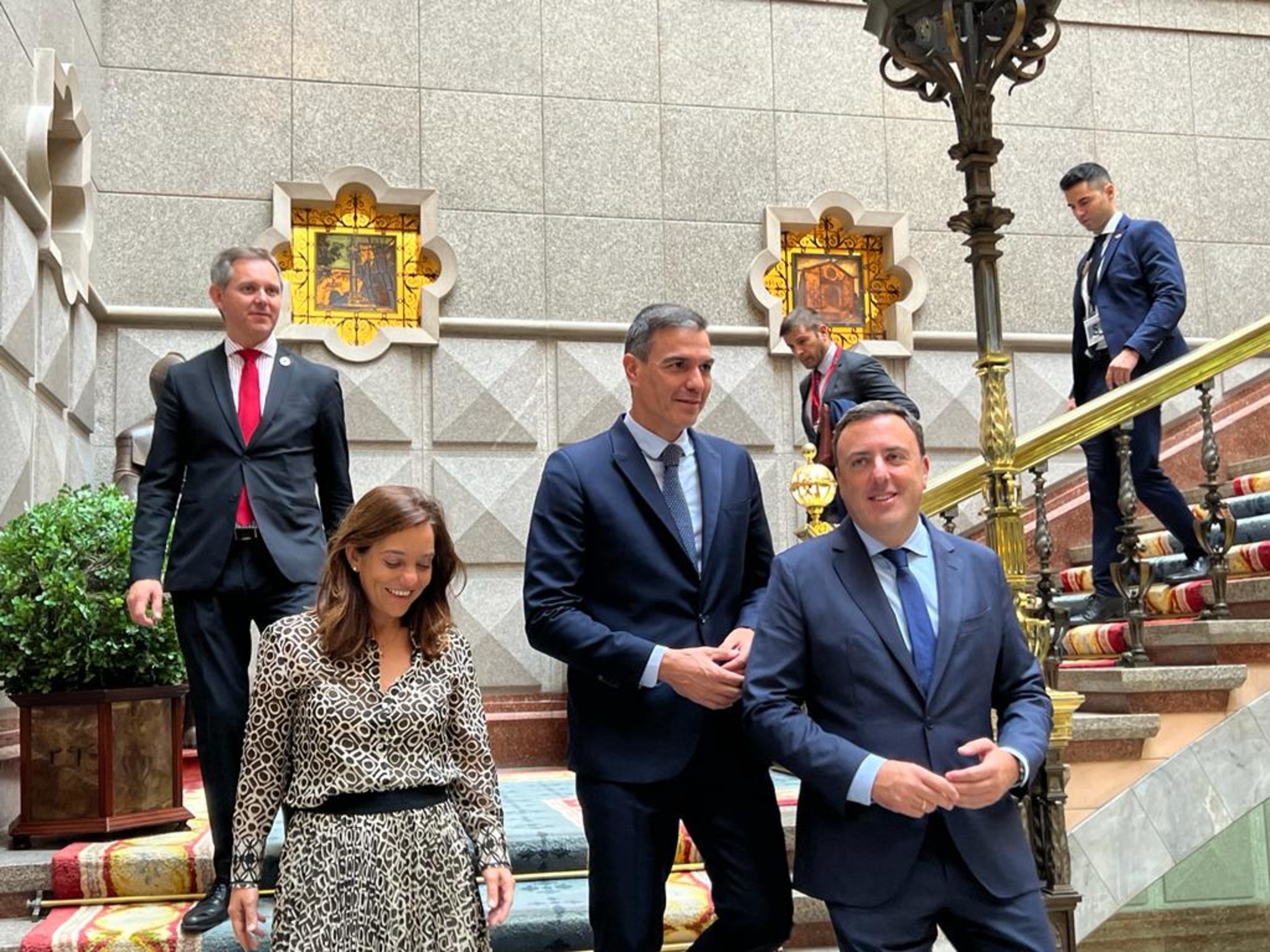 O presidente da Deputación, Valentín González Formoso, a alcaldesa da Coruña, Inés Rey García, recibiron no Pazo de María Pita o presidente do Goberno, Pedro Sánchez, á súa chegada á cidade e participaron posteriormente, xunto a outras autoridades, no acto oficial de saúdo aos participantes no cumio que acolle a cidade herculina nove anos despois da última celebrada.