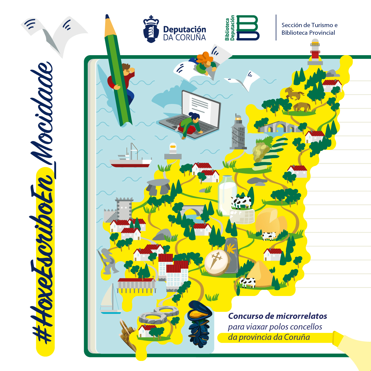 A Deputación da Coruña pon en marcha unha edición para a mocidade do seu concurso de microrrelatos #HoxeEscriboEn. A través das súas áreas de Turismo e Cultura, e en colaboración coa Biblioteca Provincial, a institución pon en marcha a primeira edición desta iniciativa que pretende fomentar o talento creativo, a animación é escritura e á lectura, o impulso do idioma e a difusión do patrimonio dos concellos da provincia entre os mozos e mozas.