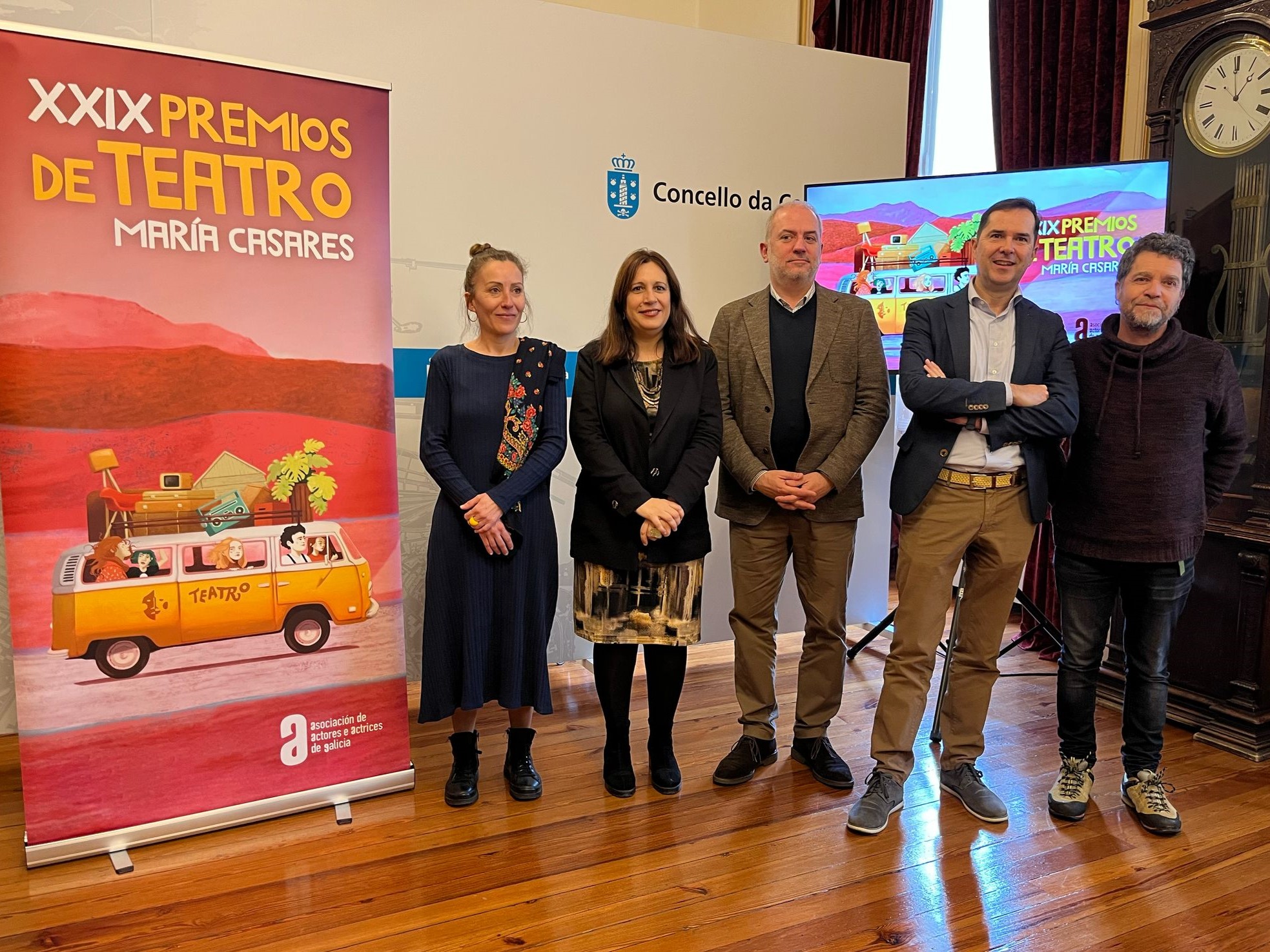 Os XXIX Premios de Teatro María Casares entregaranse o próximo xoves, 3 de abril, no Teatro Rosalía de Castro da Coruña a partir das 20.30 horas. Hoxe celebrouse a presentación oficial, onde participou a deputada de cultura, Natividade González, acompañada polo director da gala deste 2025, Fernando Dacosta; polo concelleiro de Cultura e Turismo do Concello da Coruña, Gonzalo Castro; polo director da Axencia Galega das Industrias Culturais, Jacobo Sutil, e Arantza Villar, presidenta da AAAG.