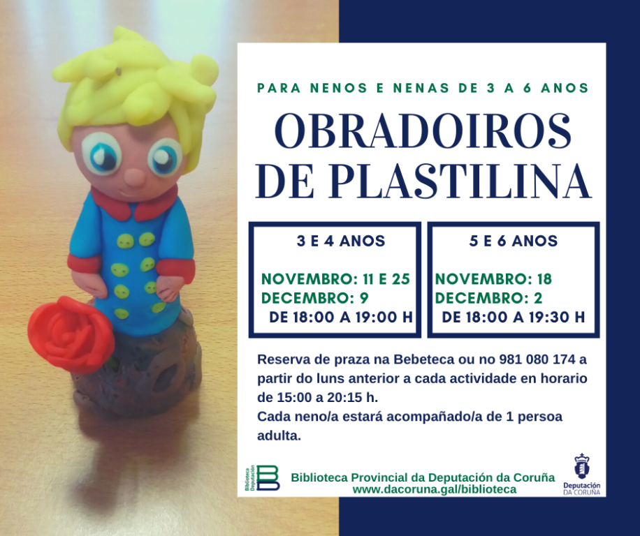 10 prazas por cada sábado. Reservar praza (1 por neno/a agás irmáns/ás) na Bebeteca ou chame ao teléfono 981 080 174 a partir do luns anterior a cada actividade en horario de 15:00 a 20:15 h. Cada neno/a deberá estar acompañado/a por unha persoa adulta. Terán preferencia socios/as.
