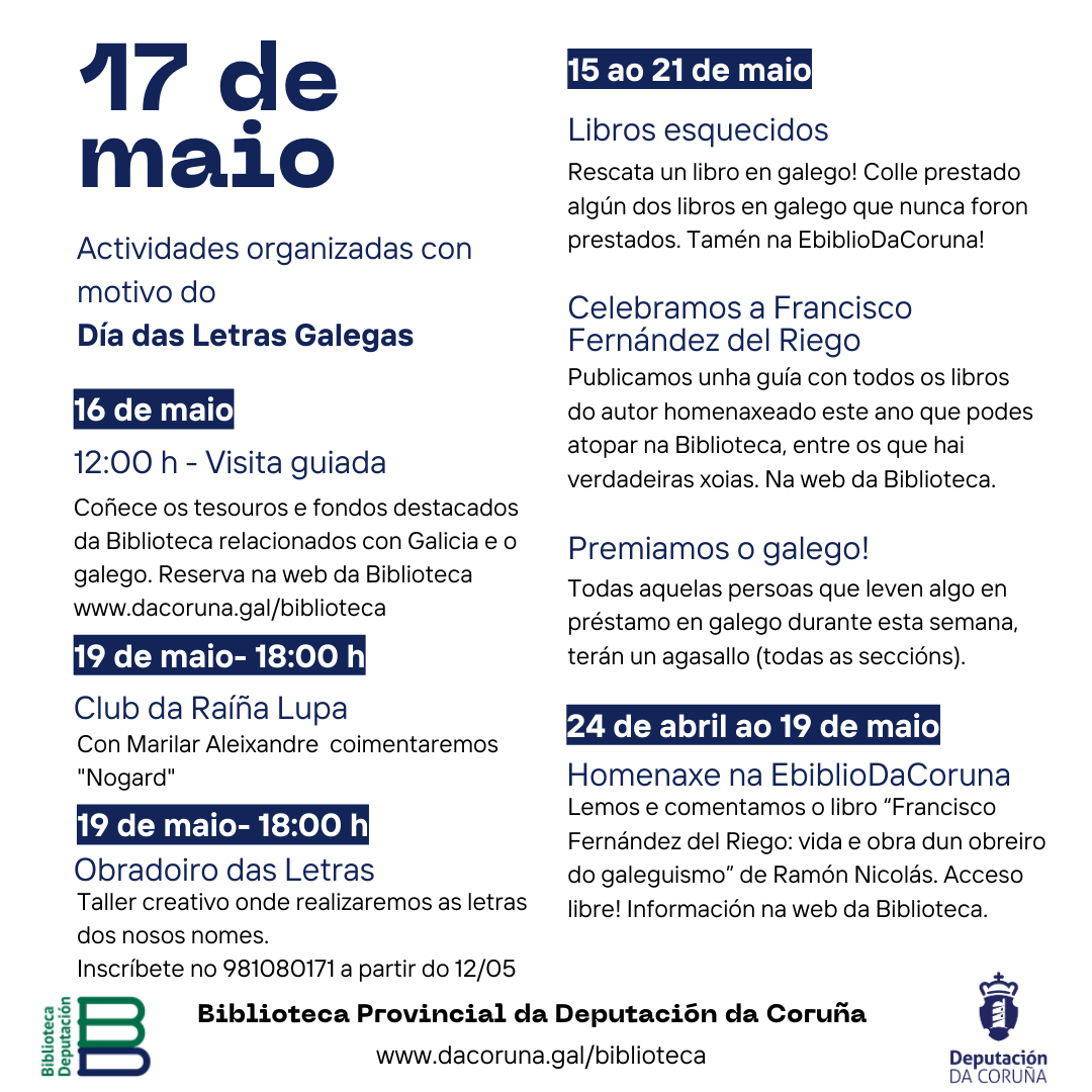 Desde a Biblioteca preparamos a seguinte programación para celebrar as nosas letras durante todo o mes: