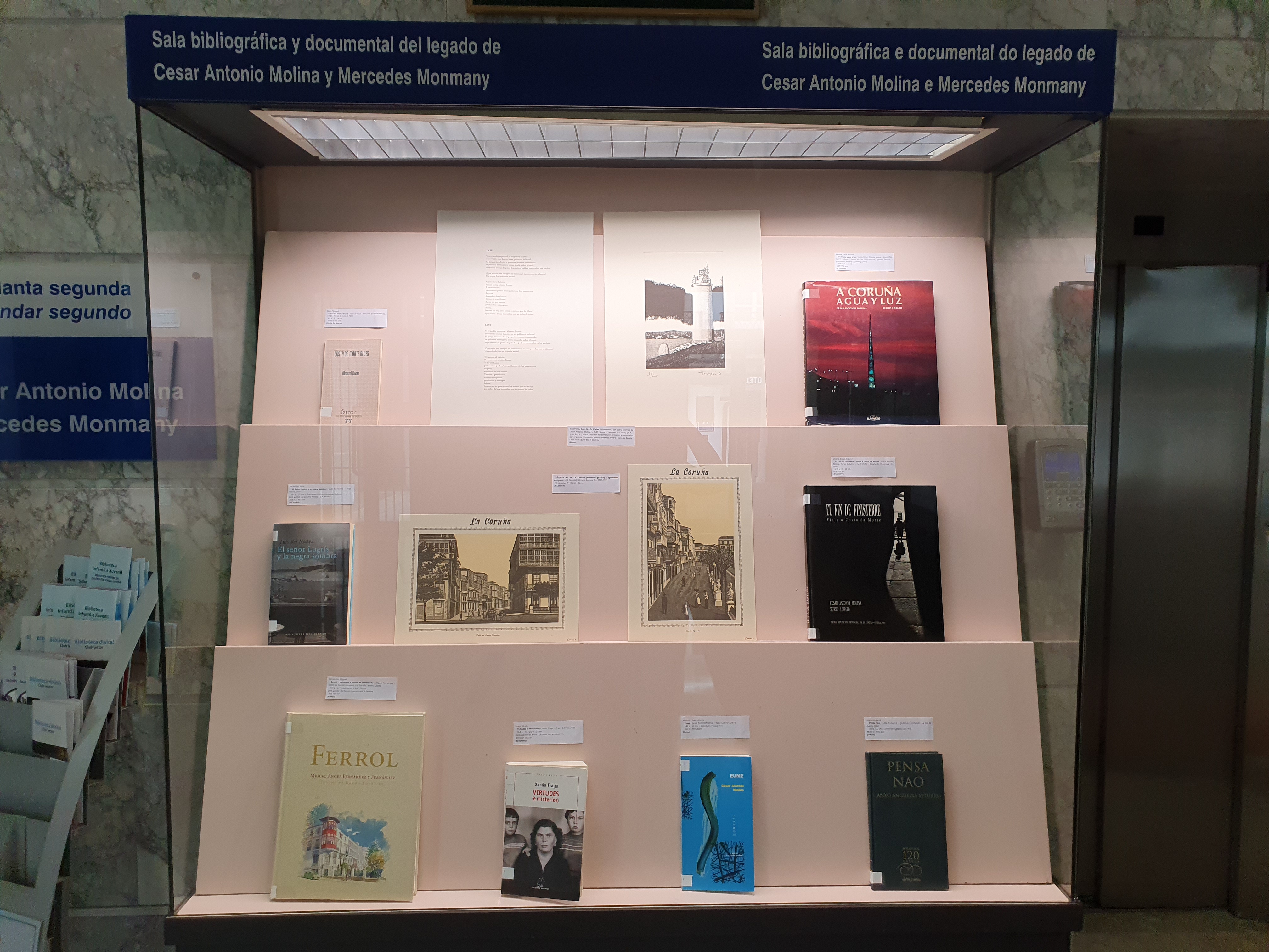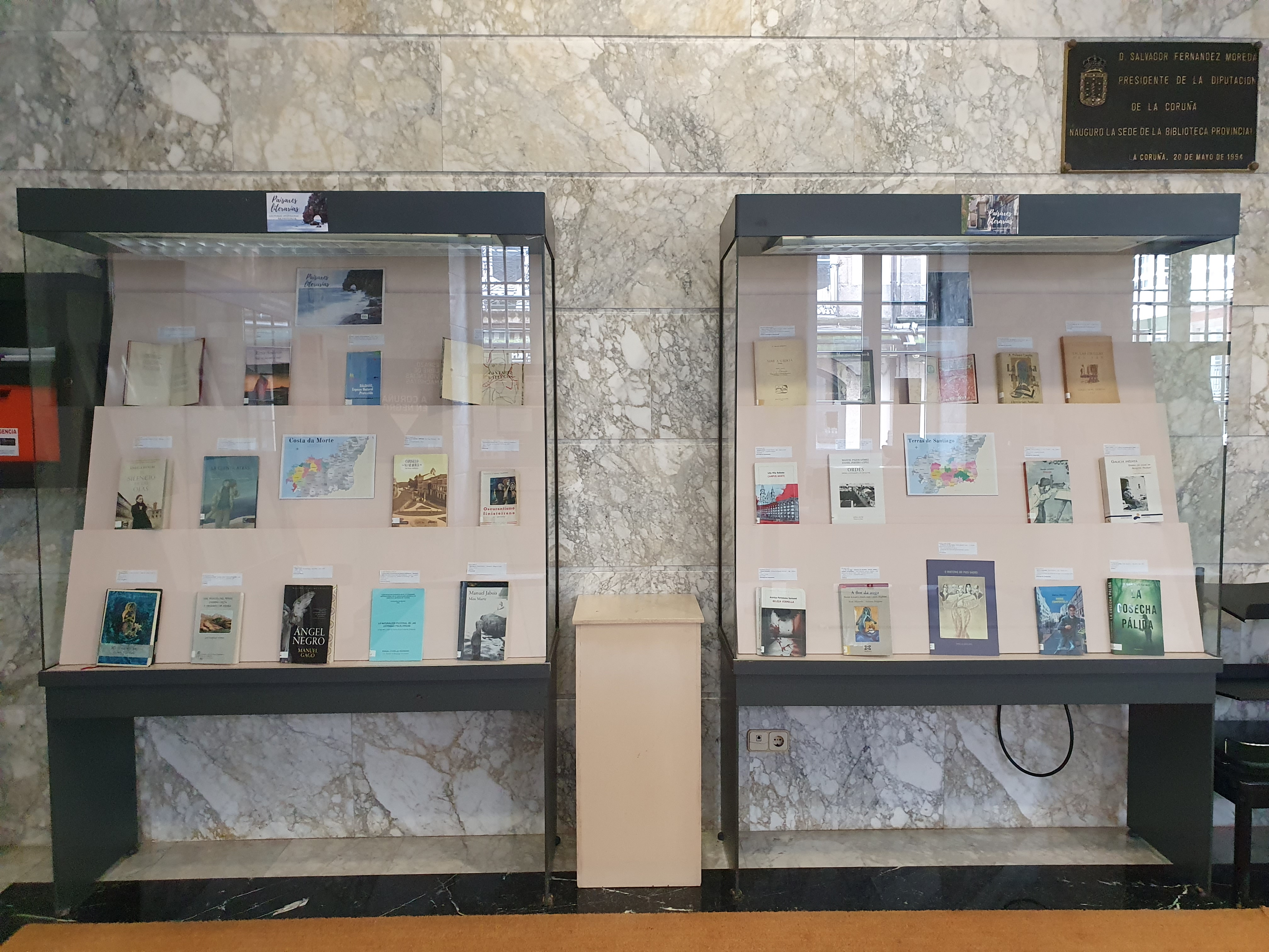 Mostra bibliográfica dispoñible no vestíbulo da Biblioteca sobre literatura ambientada na provincia da Coruña.
