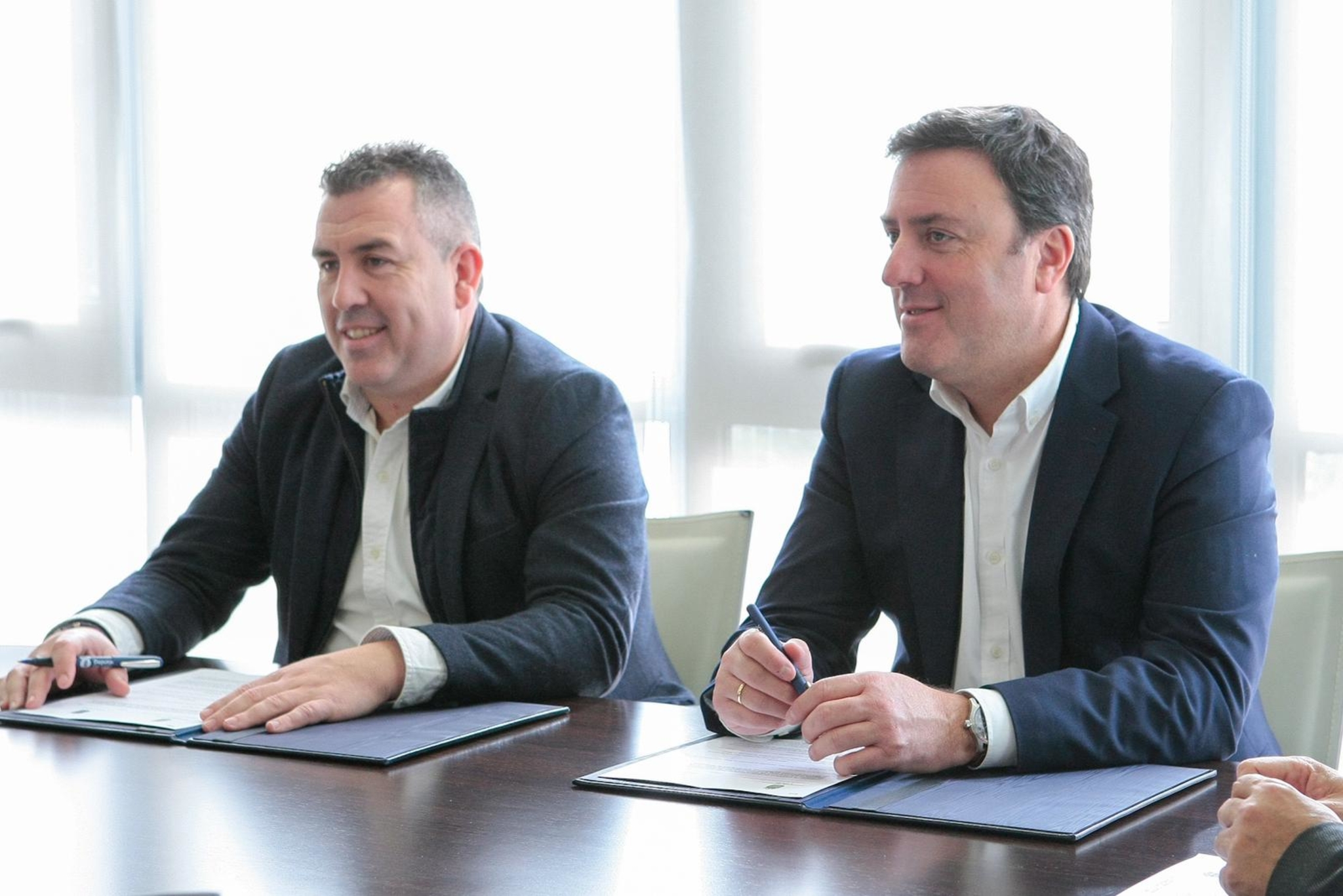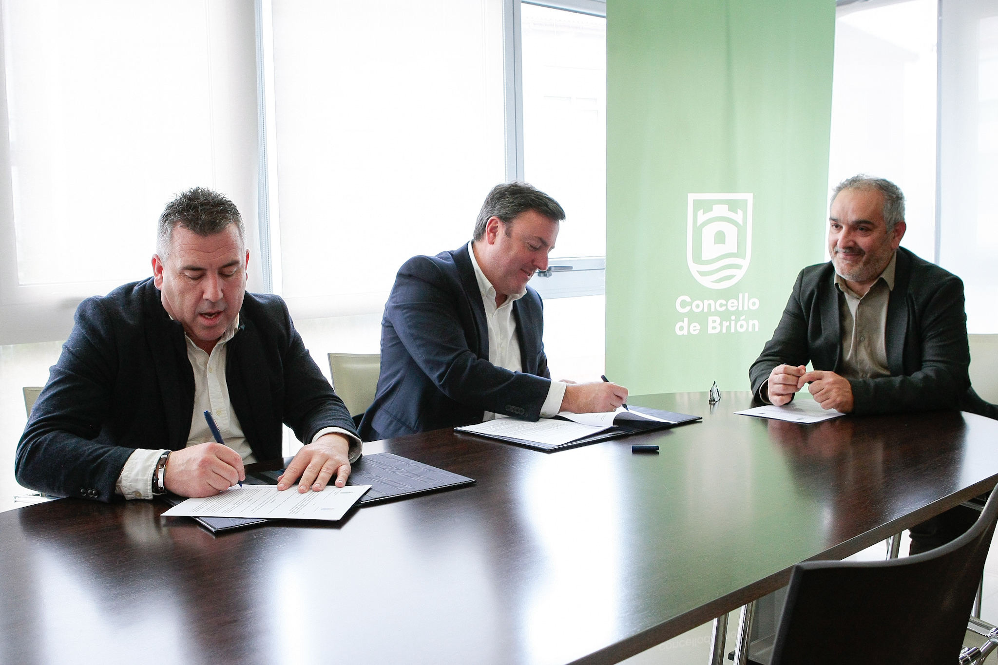 O presidente da Deputación da Coruña, Valentín González Formoso, e o alcalde de Brión, Pablo Lago Sanmartín, asinaron un convenio polo que a entidade provincial achegará 150.000 euros para realizar as obras de ampliación do pavillón municipal de deportes de Pedrouzos, nun acto no que tamén estivo presente o deputado de Contratación Xosé Penas.