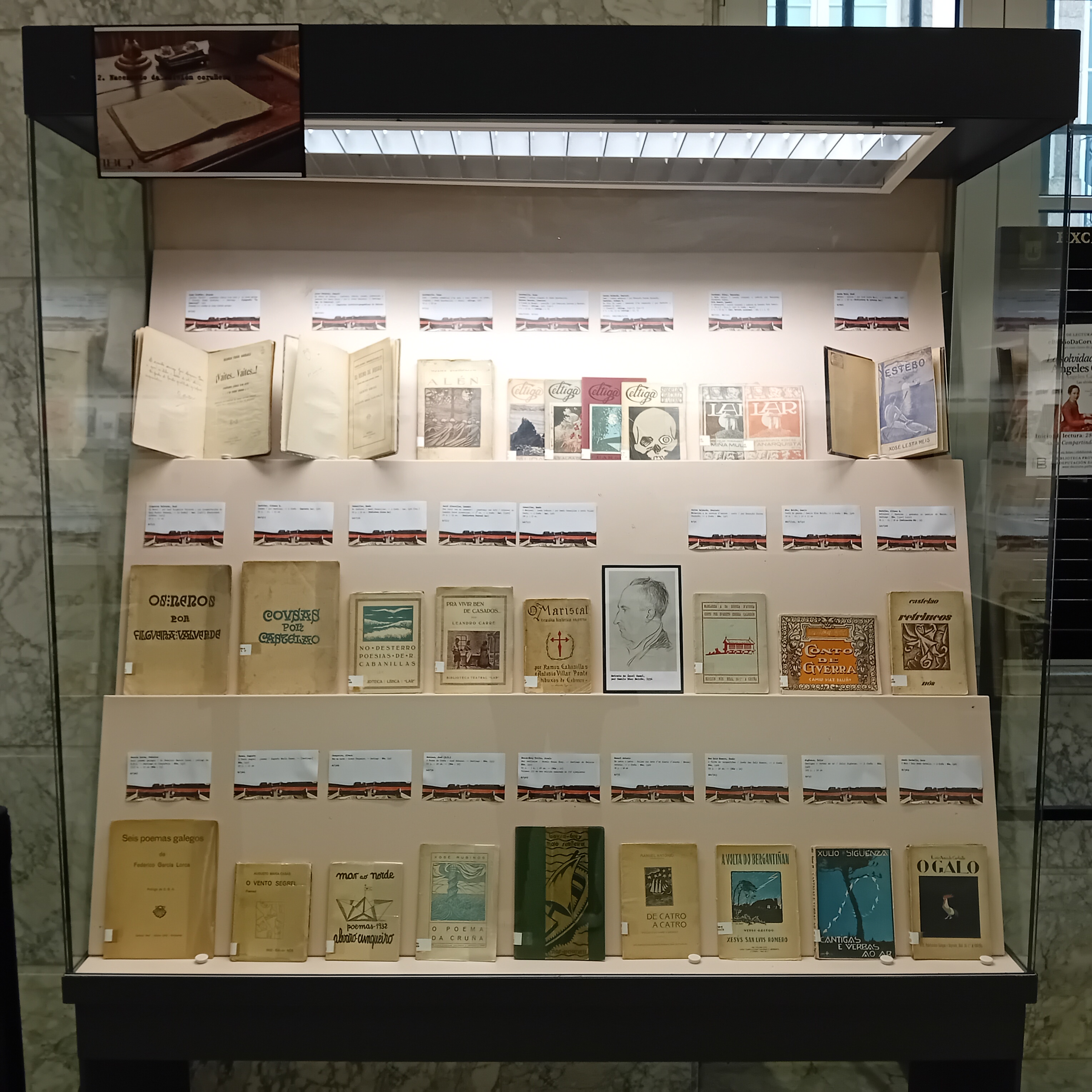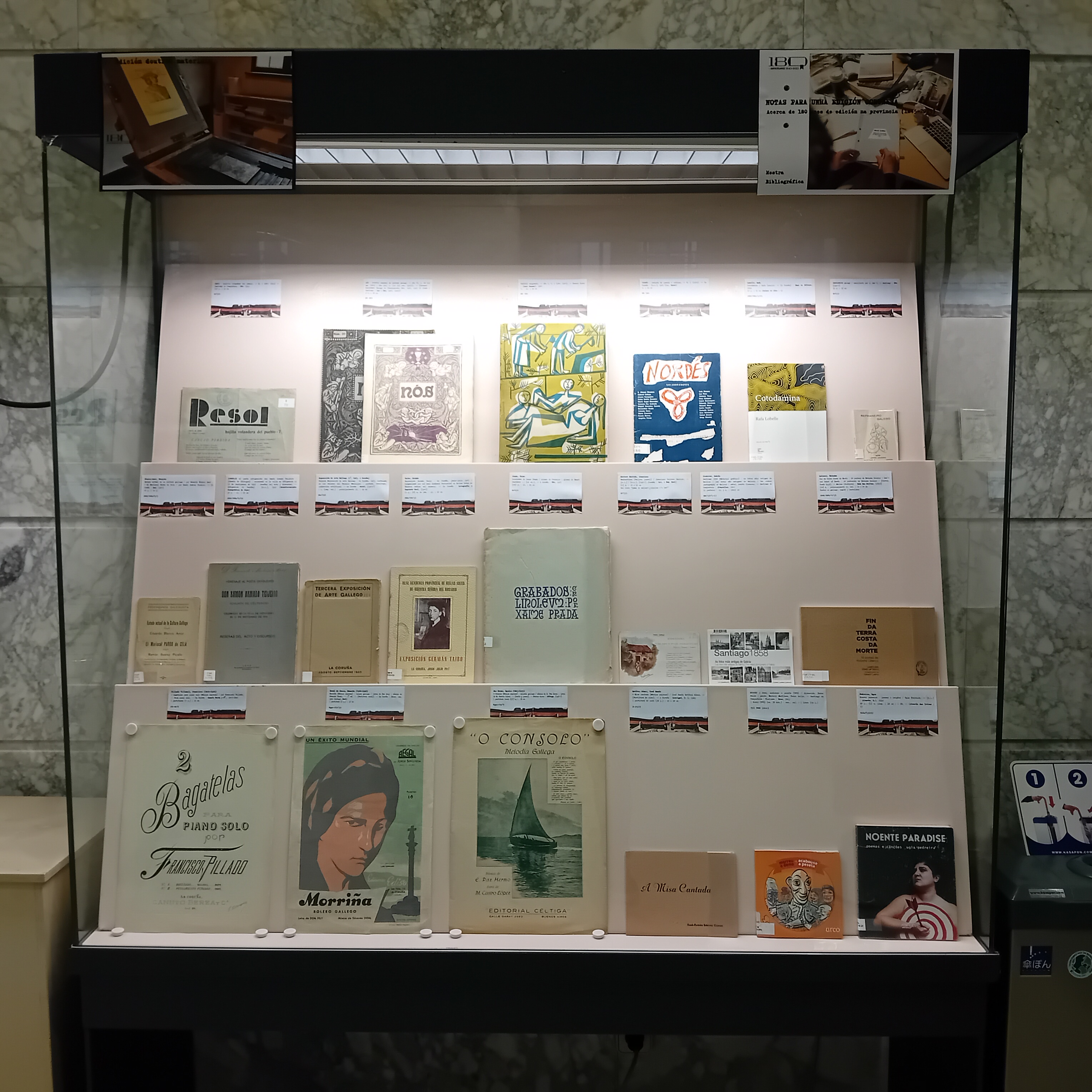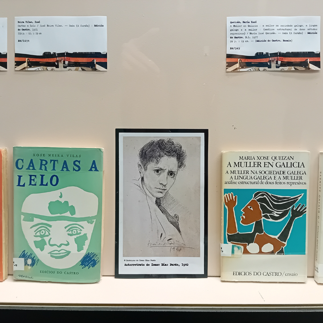 Esta vitrina exhibe materiais de diverso tipo e formato: revistas, folletos literarios e informativos, catálogos de exposicións, libros ilustrados, postais, partituras e libros-cd. É un exemplo da diversidade da produción destas entidades: Canuto Berea, Roel, Fojo, Moret, Lar, Nós, Céltiga, Librigal, Luis Seoane, Alvarellos, Urco, Através, Casa das Peritas e Chan da Pólvora.