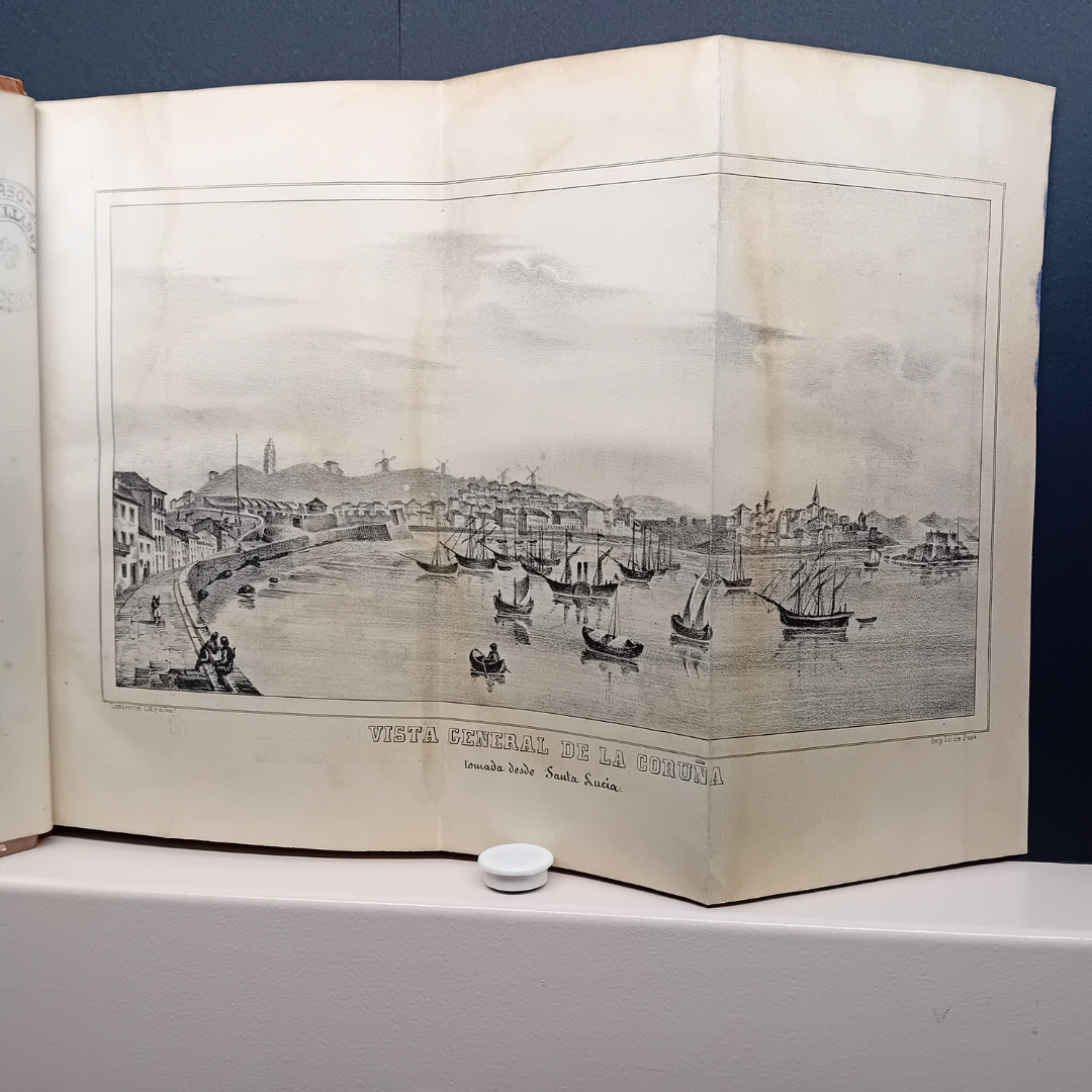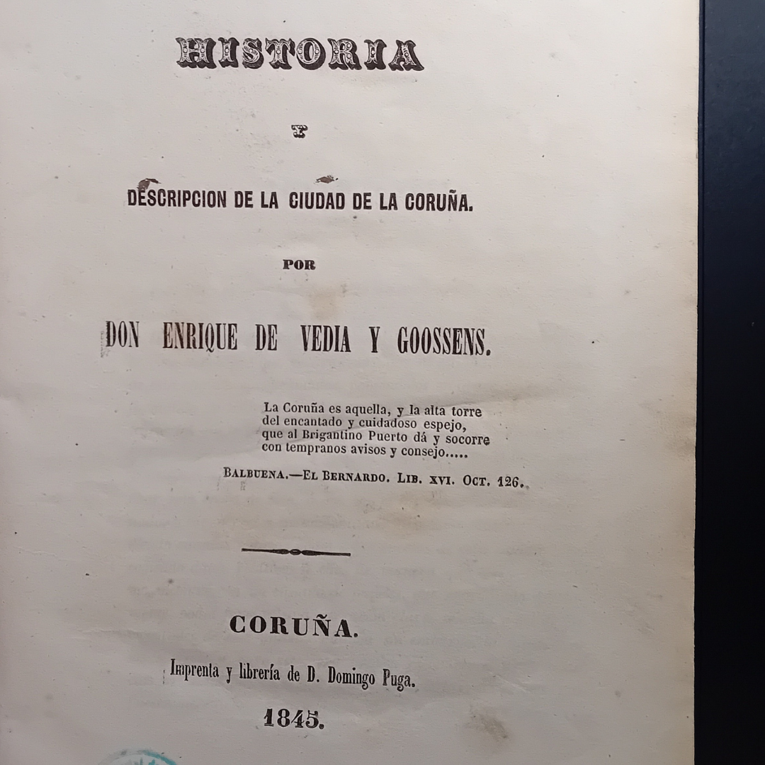 Hoxe queremos falar da obra máis antiga que podedes atopar exposta, xa que foi publicada en 1845, ano que nace a #BPDC: Historia y descripción de la ciudad de La Coruña é unha das primeiras crónicas da cidade da Coruña, por este motivo espertou bastante interese na localidade no seu momento. O seu autor é Enrique de Vedía y Goossens (o gobernador civil da cidade) e foi publicada pola Imprenta e Libraría de D. Domingo Puga.