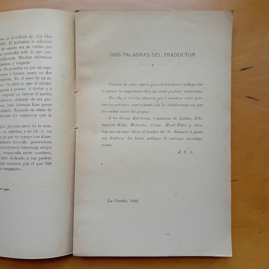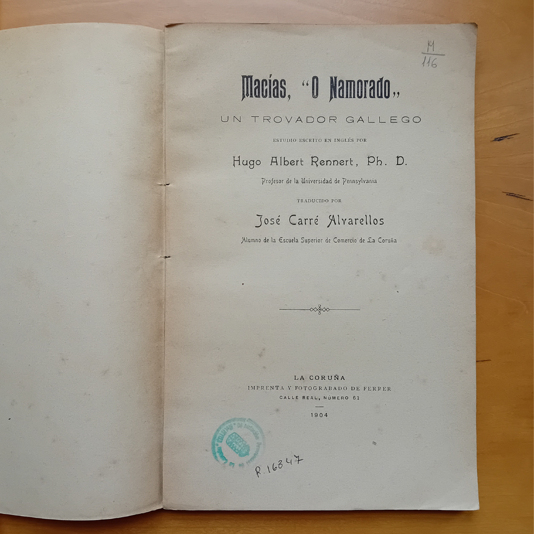 A primeira delas, destaca por tratarse dunha tradución ao castelán do estudo Macias, O Namorado: a galician trobador, publicado en 1900 polo hispanista estadounidense Hugo Albert Rennert. Rennert foi profesor de linguas románicas e literatura na Universidade de Pennsylvania e membro correspondente da Real Academia Española, da Real Academia Galega e da Hispanic Society of America. O responsable da tradución, con apenas dezaoito anos, foi José Carré Alvarellos (1884-1904). Fillo do historiador e editor coruñés Eugenio Carré Aldao, José graduouse na Escola Superior de Comercio e colaborou no Diccionario Gallego-Castellano de Marcial Valladares, aportando anotacións de vocábulos e sinónimos que el mesmo recolleu. Este libro saíu do prelo trala prematura morte de José, sendo o estudo publicado con anterioridade no xornal lucense La Idea Moderna.