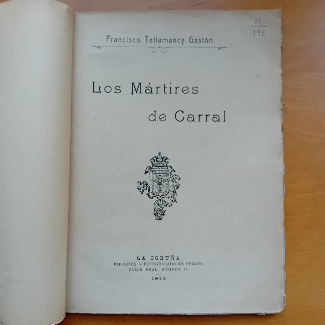 A segunda das obras é Los mártires de Carral, de Francisco Tettamancy Gastón. Tettamancy foi un historiador e escritor coruñés, ademais de Funcionario da Deputación Provincial da Coruña. Tamén foi membro fundador da Real Academia Gallega, correspondente da Real Academia de la Historia e da Real Academia de Bellas Artes de San Fernando e vogal da asociación rexionalista Liga Gallega na Cruña. Esta última é a organización da que parte a iniciativa de levantar o monumento Aos Mártires da Libertade en Carral, sendo o propio Tettamancy un dos seus impulsores. Esta publicación presenta un estudo histórico moi documentado da Revolta Galega de 1846. Conta con diversas ilustracións en branco e negro acompañando ao texto, algunhas delas creadas pola propia, "Imprenta y Fotograbado de Ferrer".