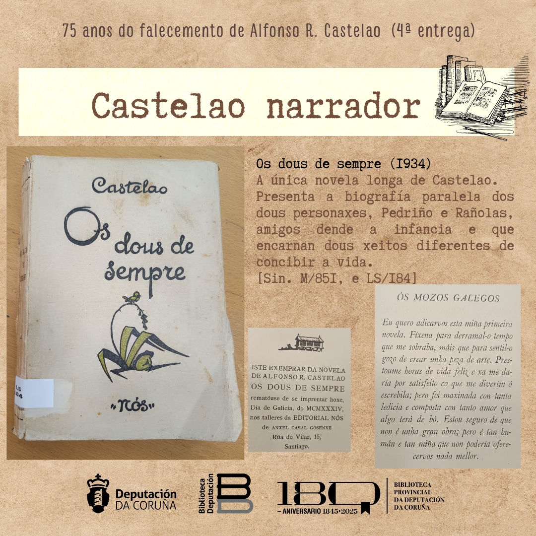 é a única novela longa de Castelao. Presenta a biografía paralela dos dous personaxes, Pedriño e Rañolas, amigos dende a infancia e que encarnan dous xeitos diferentes de concibir a vida. Foi traducida ao castelán[75] e ao éuscaro.