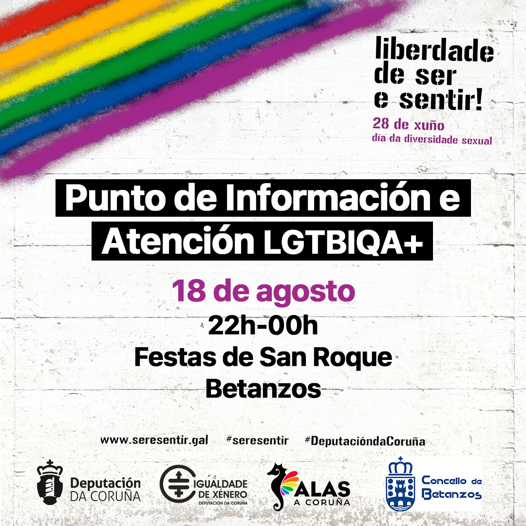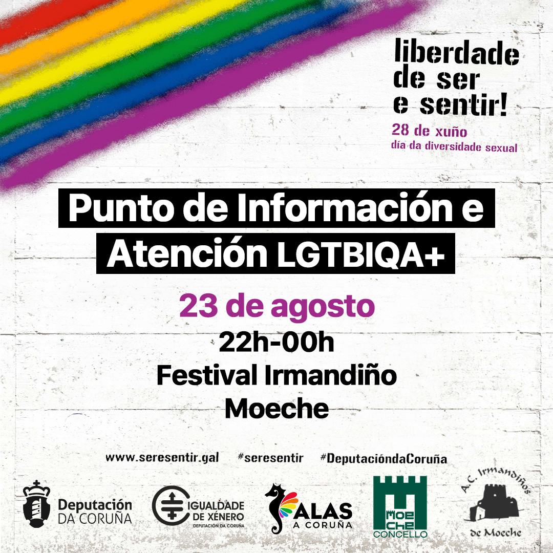 A asociación LGTBI+ ALAS A Coruña poñerá en marcha un total de oito puntos informativos en festivais e festas populares da provincia, ao abeiro da campaña Liberdade de Ser e Sentir, impulsada ao longo de todo o ano polo departamento de Igualdade e Dereitos Civís da Deputación da Coruña para a defensa dos dereitos da comunidade LGTBI+. A primeira das citas na que se instalarán os puntos é, mañá mesmo, a Carballeira de Zas.