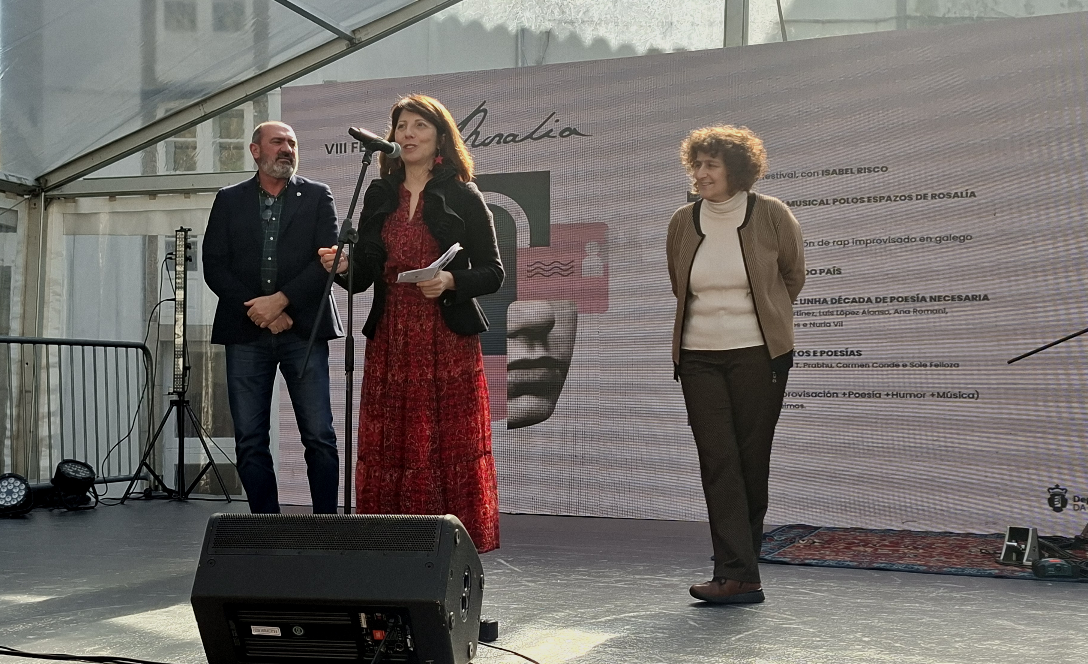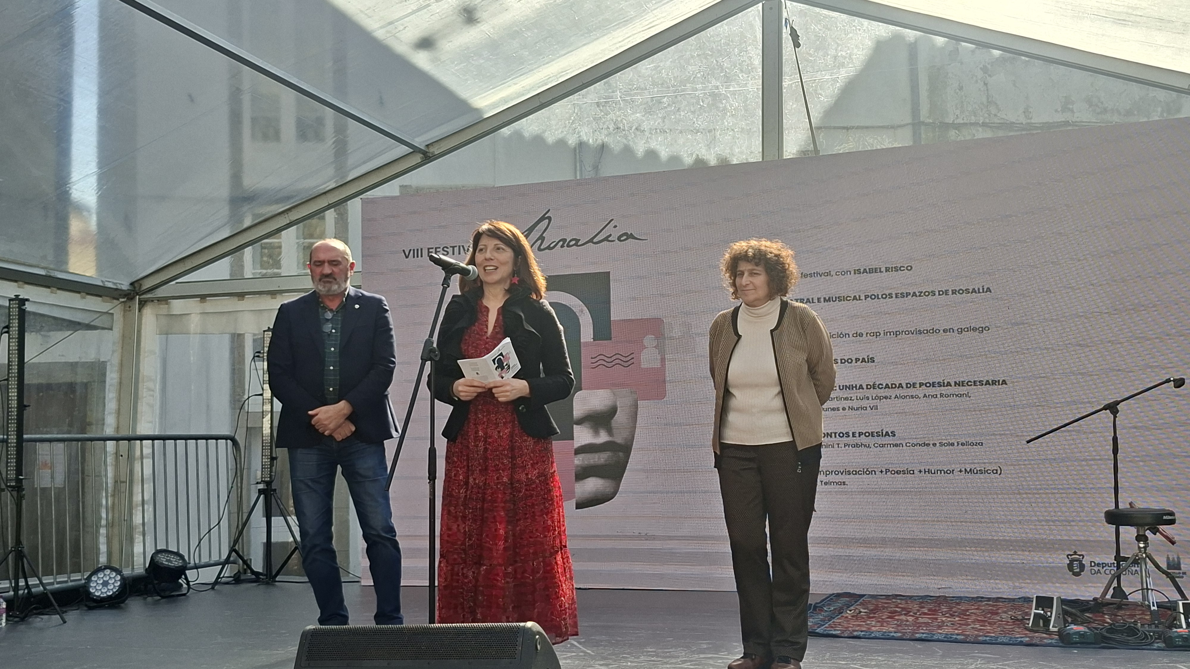 O Festival Rosalía, organizado pola Deputación da Coruña en colaboración co Concello de Santiago de Compostela, botou a andar hoxe a súa oitava edición. «Este festival non só reivindica a figura de Rosalía, senón que socializa o seu legado», salientou na inauguración oficial deste encontro a deputada de Igualdade, Lingua e Dereitos Civís da Deputación da Coruña, Sol Agra. Na súa intervención tamén puxo en valor a pegada histórica da autora de Follas novas nos ámbitos da lingua, do feminismo e mesmo da ecoloxía. Neste último punto, Agra lembrou a posición que a autora amosou no seu día fronte á tala indiscriminada na Carballeira de Conxo, aló cara a 1881.