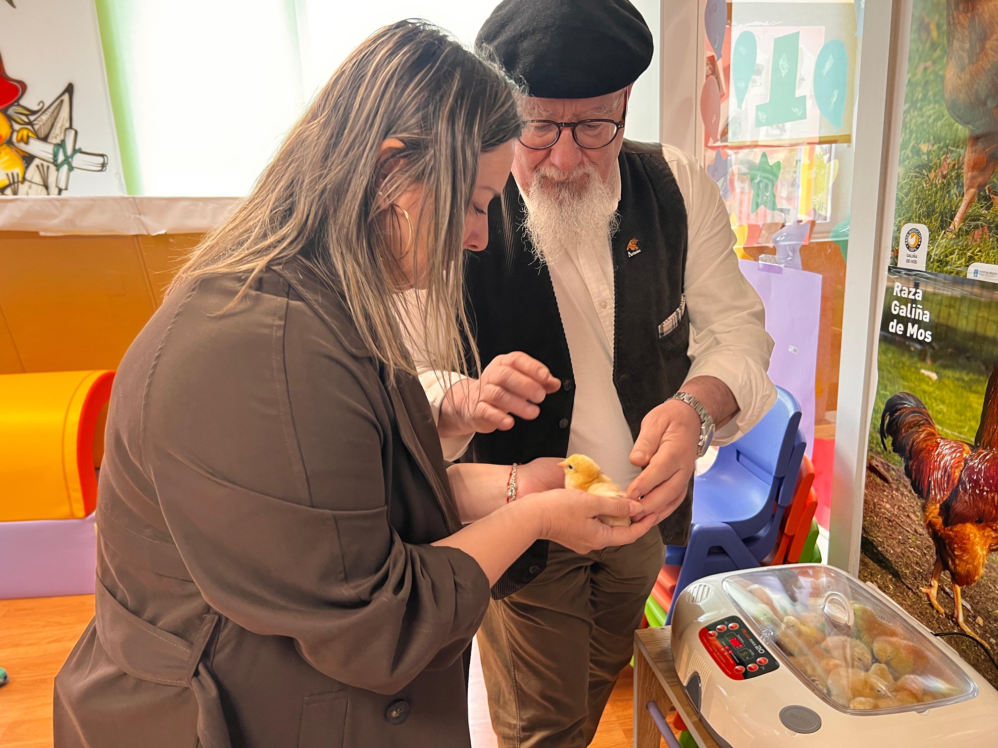 A deputada de Mar e Medio Rural, Cristina Capelán, participou nesta xornada, que coincidiu cun dos momentos máis especiais da actividade e o máis agardado polo alumnado: o nacemento dos pitiños tras o proceso de incubación. A iniciativa permitelles ás nenas e nenos observar de primeira man este proceso natural e coñecer, a través dunha charla didáctica adaptada a súa idade, as características da Galiña de Mos, a súa crianza e a súa importancia no medio rural galego.